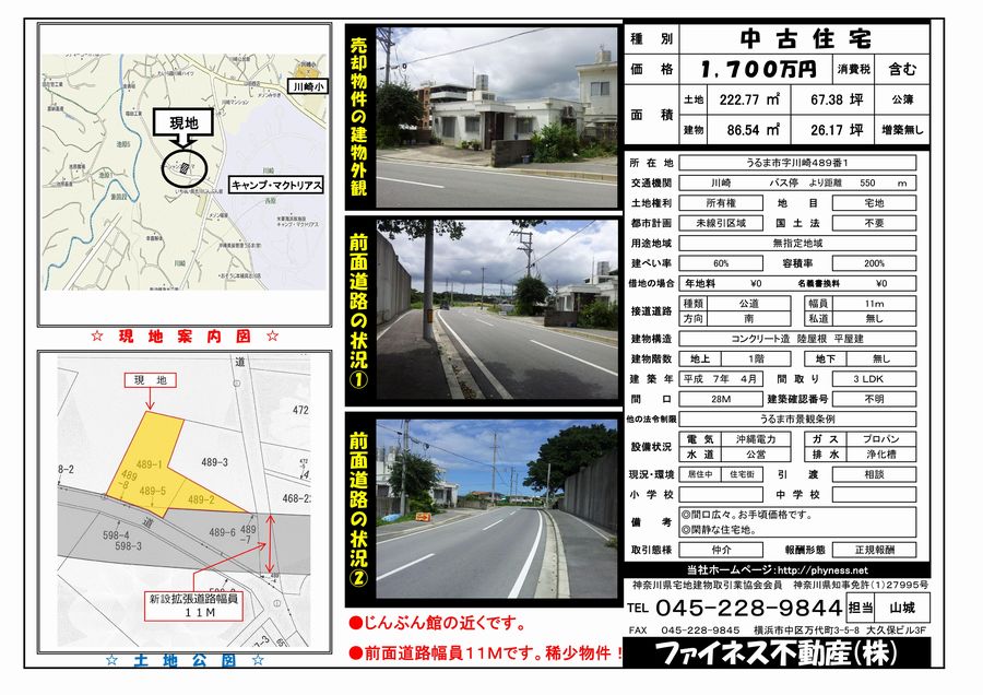 ●土地権利/所有権 ●地目/宅地 ●都市計画/未指定 ●国土法/届出不要 ●用途地域/無指定地域 ●建ペイ率/60% ●容積率/200% ●条例/うるま市景観条例 ●建物構造/コンクリートブロック造 陸屋根 平屋建て ●築年月/平成7年4月新築 ●引渡/相談 ●取引/仲介